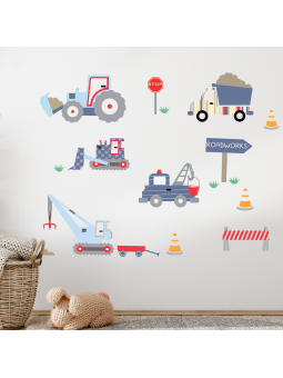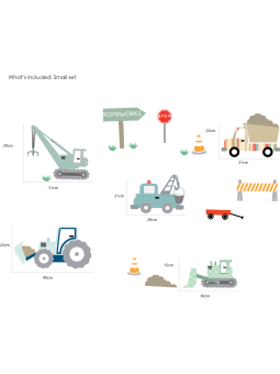 Construction Site Wall Stickers printed and cut on premium fabric material A complete theme of stickers that can be grouped or separated when applied to the wall. Available in 2 colour options: Option 1: Greens Option 2: Red and blues