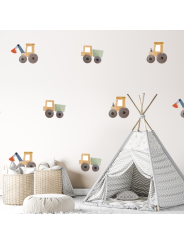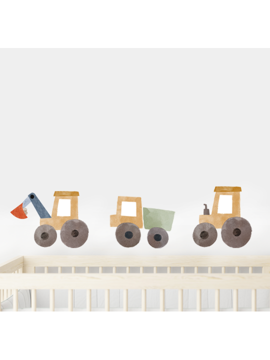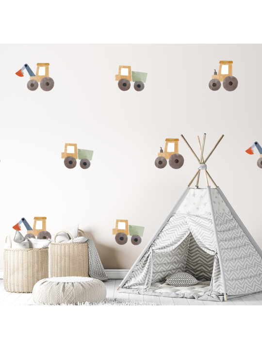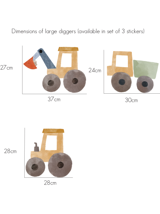 Available in sets of 3 large diggers to create a focal point or a sets of 15 or 30 small digger stickers to create a uniform pattern.