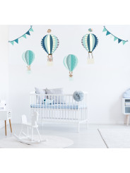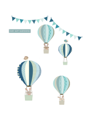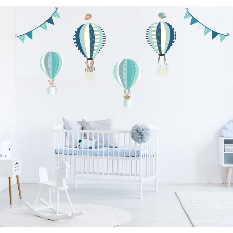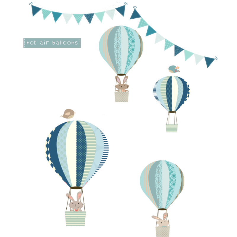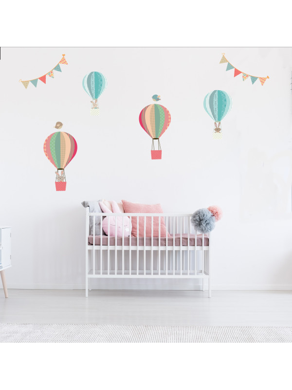 Hot air balloons and cute bunnies create this beautiful theme, bright colours perfect for your nursery or child’s room.